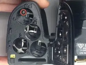 Выверните единственный винт Phillips 2,0 мм #000, расположенный на тёмно-коричневой полосе на задней стороне панели кнопки затвора.