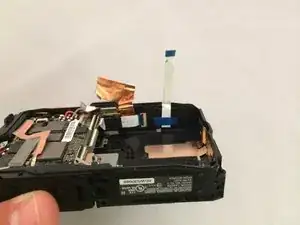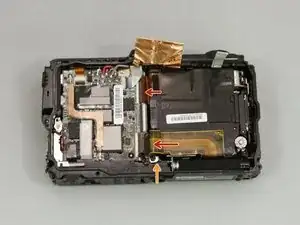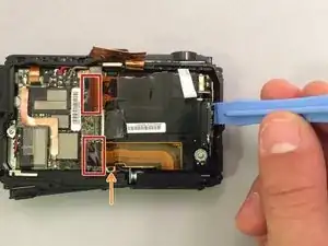 Найдите защёлку для оранжевого шлейфа между платой и блоком объектива.