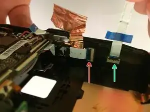 Удалите винт Phillips #00 и серебряный металлический натяжитель под этим винтом. Удалите винт Phillips (размер) рядом с шлейфом.
