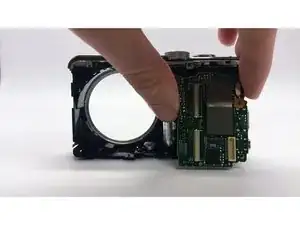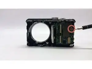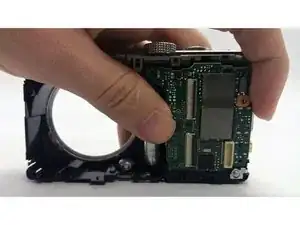 После снятия объектива остаётся один винт, удерживающий основную материнскую плату. Удалите этот винт, расположенный с правой стороны платы, и снимите его.