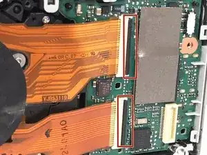 После снятия пластикового упора приступайте к извлечению объектива. Для этого проследите два шлейфа данных, соединяющих объектив с основной материнской платой, и отщёлкните их, повернув чёрную планку в положение, перпендикулярное плате. После открытия защёлок шлейфы и объектив должны свободно выскользнуть.