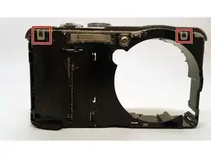 Найдите по два винта с каждой стороны камеры и выкрутите их. Затем найдите пару винтов на нижней части камеры, по одному с каждой стороны области для винта штатива, и выкрутите их.