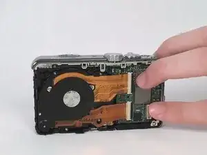 С помощью пластикового лопаточного инструмента снимите крышку камеры на той же стороне, где располагается ЖК-экран. Эта крышка должна сниматься сравнительно легко и откроет материнскую плату, к которой подключён экран.