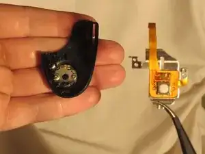 С помощью пинцета снимите металлическую крышку, чтобы получить доступ к кнопке затвора. Возьмите новую кнопку затвора и установите её на место оригинальной детали.