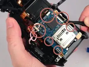 Отсоедините девять ленточных кабелей, соединяющих плату с корпусом камеры.