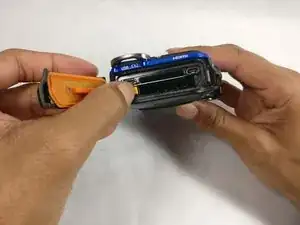 Потяните оранжевую вкладку в сторону шарнира, чтобы освободить батарею.