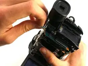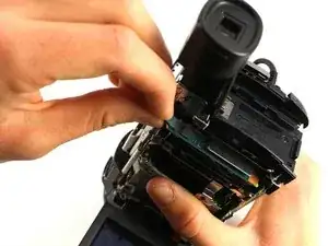 Удалите винт Phillips #00 длиной 3 мм между видоискателем и панелью, расположенной непосредственно справа от отсека аккумулятора.
