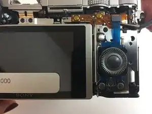 После снятия задней крышки с помощью пинцета вытащите ленточный кабель, удерживающий колесо настройки.