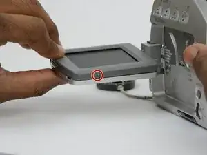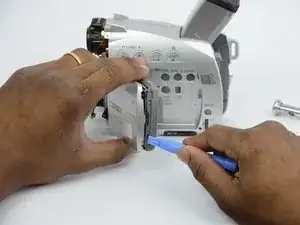 На мониторе ЖК, в месте его соединения с основным корпусом видеокамеры, находится винт 2,7 мм. Удалите этот винт.
