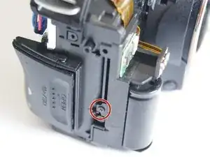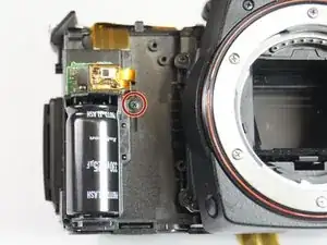 Снимите винт Phillips #00 длиной 5,0 мм с левой стороны камеры рядом с конденсатором вспышки.