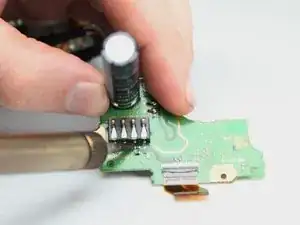 Нагрейте и удалите припой на двух указанных контактных площадках конденсатора.