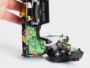 Используя крестовую отвертку PH0, снимите два указанных чёрных винта длиной 6.0 мм с верхней части камеры под механизмом вспышки.