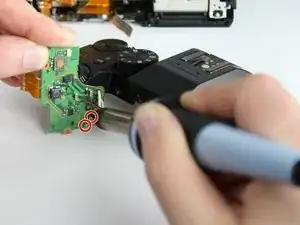 Снимите два указанных серебристых винта длиной 3.5 мм, расположенных рядом с экраном видоискателя, используя крестовую отвертку PH0.