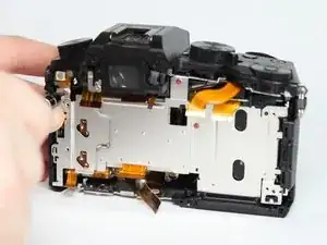 Оттяните верхнюю панель от остальной части камеры, чтобы обнажить провод вспышки и пластиковую крышку.