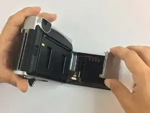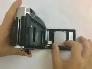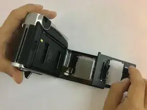 Полностью откройте крышку и снимите её с камеры. Выньте батарею и снова установите крышку.