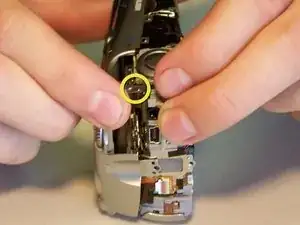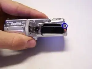 Удалите винт в отсеке для батареи, обозначенный синим кругом, снова используя отвертку Phillips #00.