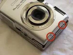 Удалите два боковых винта, обозначенные красными кругами, с помощью отвертки Phillips #00.
