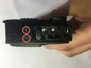 С правой стороны камеры также есть два винта, которые отмечены на фото. Удалите эти винты во-вторых.