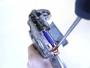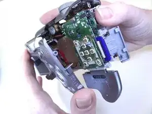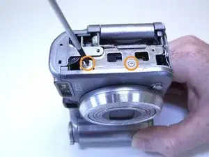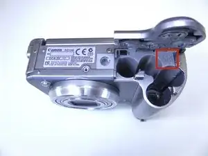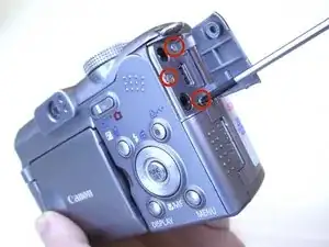 Открутите винт Phillips #00 1.6x3 мм под крышкой отсека для карты памяти.