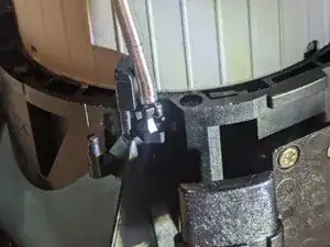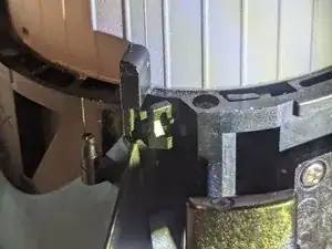 Здесь видна возвратная пружина, возвращающая диск регулировки яркости в исходное положение. Её необходимо отсоединить, чтобы снять переднюю крышку.