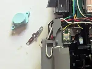 Держатель возвратной пружины диска яркости показан со пружиной в правильном положении.