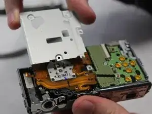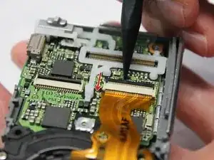 Аккуратно приподнимите и снимите корпус объектива, вытянув его из теперь отключённого ленточного кабеля.