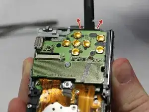 С помощью острого конца лопатки отогните вверх две чёрные защёлки, удерживающие ленточные кабели на месте.