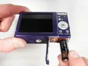 Откройте отсек батареи внизу камеры, сдвинув крышку вправо.