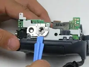 Проведите инструментом вверх по стороне видеокамеры, как показано. Аккуратно отделите ЖК-панель от остальной части видеокамеры.