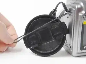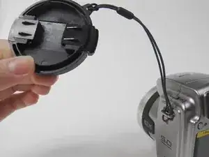 Разделите две части петли и потяните крышку объектива вверх между ними.