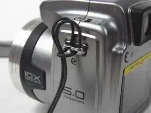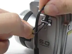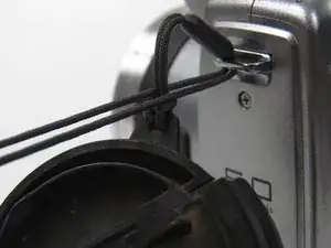 Потяните крышку объектива, и шнур выйдет из металлической пластины.