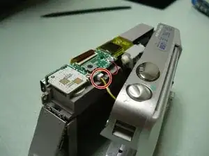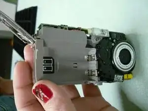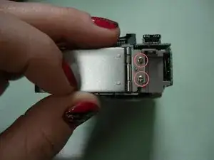 Найдите и удалите два винта, крепящих крышку отсека для батареи к остальным частям камеры.