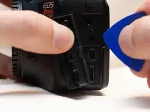 С помощью пластикового инструмента или другого тонкого пластикового поддевателя отклейте крышку разъема I/F от камеры.