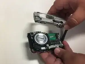 Используйте пальцы или лопаточку, чтобы приподнять один край задней крышки и отщёлкнуть её от задней части корпуса камеры.