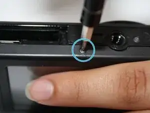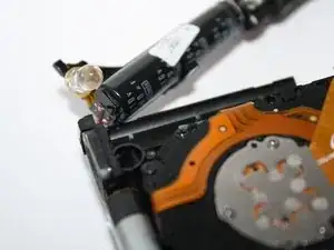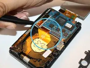 Затем потяните черный зажим, находящийся в нижнем правом углу камеры, вправо с помощью пластикового инструмента. Он удерживает основную плату.