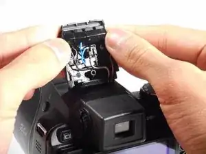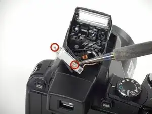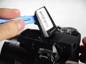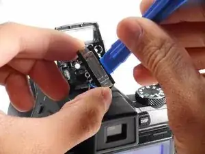 Поместите пластиковый монтажный инструмент вдоль шва на боковой стороне крышки отсека вспышки и подденьте, чтобы отщёлкнуть и снять крышку.