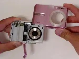 Переверните камеру лицом к вам (сторона с объективом). Осторожно снимите переднюю крышку.