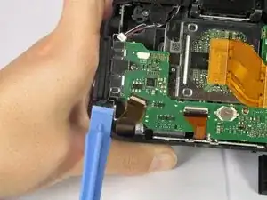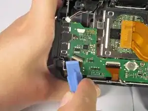 Используйте пластиковый инструмент для вскрытия, чтобы откинуть фиксатор разъёма лентового кабеля.