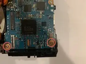 После удаления первого винта переверните камеру на нижнюю сторону и отверните два винта, расположенные ближе к задней стороне корпуса. Передний винт можно оставить на месте. Для обоих винтов используйте крестовую отвертку Phillips 00.