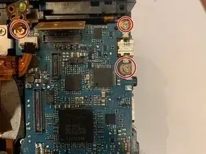 Теперь перейдите на противоположную сторону от винта у панели USB и отверните два винта, удерживающие маленькую крышку динамика на корпусе камеры. Для обоих винтов используйте крестовую отвертку Phillips 00.