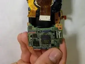 Используя чёрную нейлоновую лопатку, аккуратно поднимите ленточный кабель, который соединяет вспышку с материнской платой, и снимите вспышку с устройства.