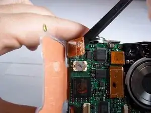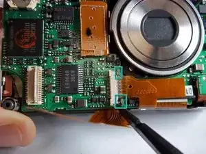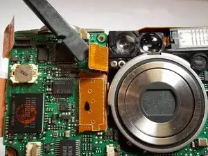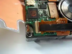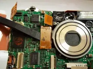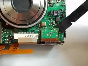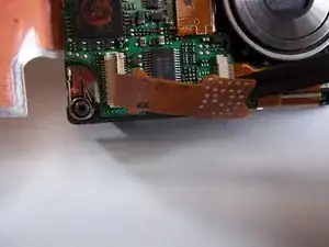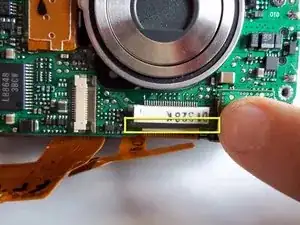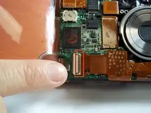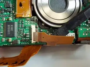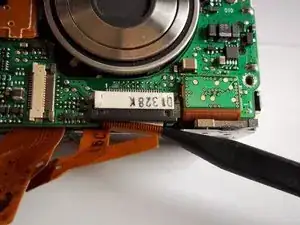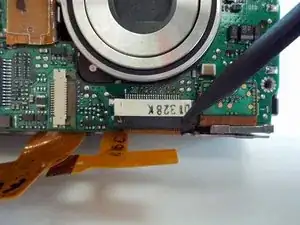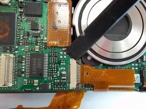 Освободите ZIF-разъём, фиксирующий ленточный кабель непосредственно под объективом. Для этого вставьте заострённый конец лопатки между чёрной частью разъёма и белой частью. Отожмите чёрную часть вниз.
