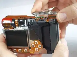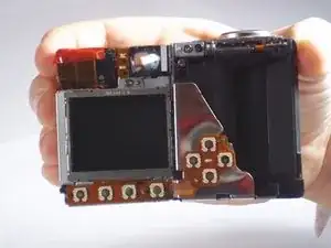 Найдите датчики кнопок, которые соединяются с платой через гибкий шлейф, осмотрев заднюю часть фотоаппарата после снятия задней панели.