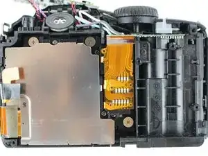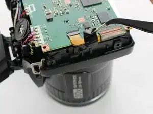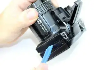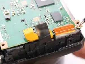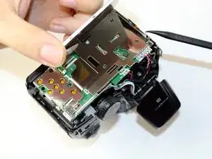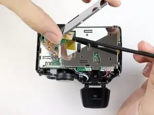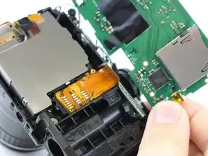 В камере, разобранной для этого руководства, ЖК-дисплей легко вышел из посадочного места после снятия задней крышки. Если Ваш экран сидит плотнее, используйте пластиковый монтажный инструмент, чтобы аккуратно поддеть один из краёв экрана — это освободит его из крепления.