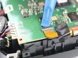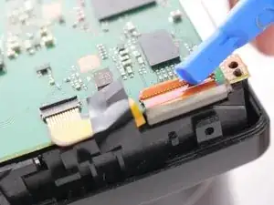 Осторожно наклоните ЖК-экран в сторону нижней части камеры и с помощью монтажной лопатки отщёлкните фиксатор ZIF-кабеля, подключенного к ЖК-экрану.