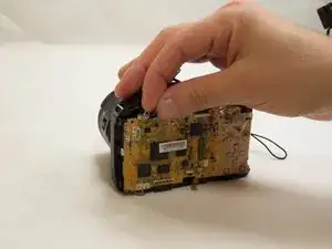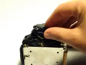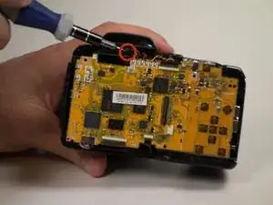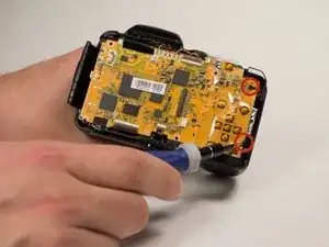 Снимите два винта Phillips #000 длиной 5 мм возле аудио/видеовыходов на противоположной стороне рядом с блоком вспышки.