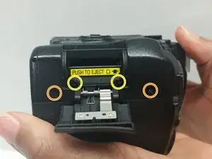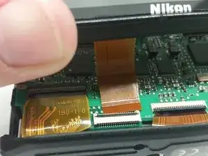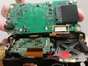 Сдвиньте кабель-переходник вдоль нижней части камеры и снимите заднюю крышку с ЖК-экраном, чтобы получить доступ к материнской плате.