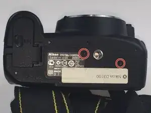 Удалите два винта длиной 4 мм, отмеченные кругами на нижней стороне фотоаппарата.