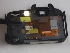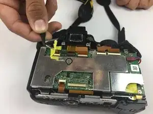 С помощью пинцета аккуратно приподнимите жёлтую ленту с задней части фотоаппарата.
