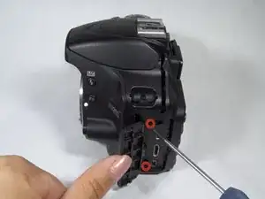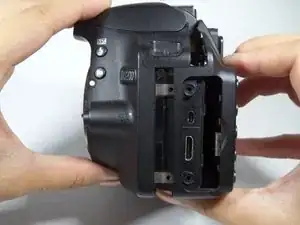 Осторожно оттяните заднюю часть корпуса камеры, начиная слева от ЖК-экрана, затем проделайте то же с другой стороны.
